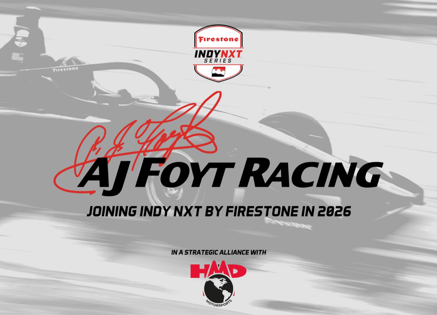 AJ Foyt Racing will extend its program into the INDY NXT by Firestone championship beginning in 2026. The team will field a two-car effort as it looks to build a strong foundation for drivers, crew, engineers, partners, and more for the future. Backed by a Strategic Alliance with HMD Motorsports, this collaboration represents the next step in strengthening the connection between INDY NXT by Firestone and the NTT INDYCAR SERIES, creating a more straightforward pathway for driver and team personnel development.