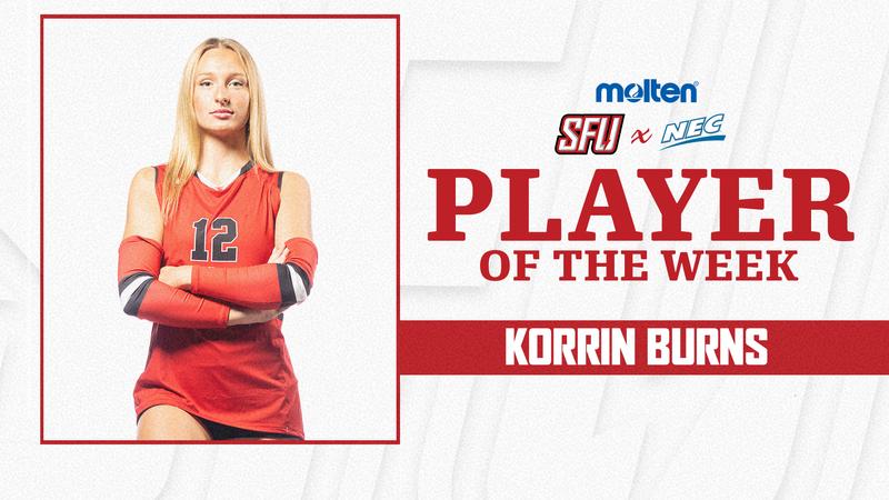 Korrin Burns (Clarion, Pa./Clarion Area), a member of the Saint Francis women’s volleyball team, has been named the NEC/Molten Women’s Volleyball Player of the Week for the sixth time this season. It is the 10th time that she obtained Player of the Week and the 13th time she received a weekly conference award in her career.
