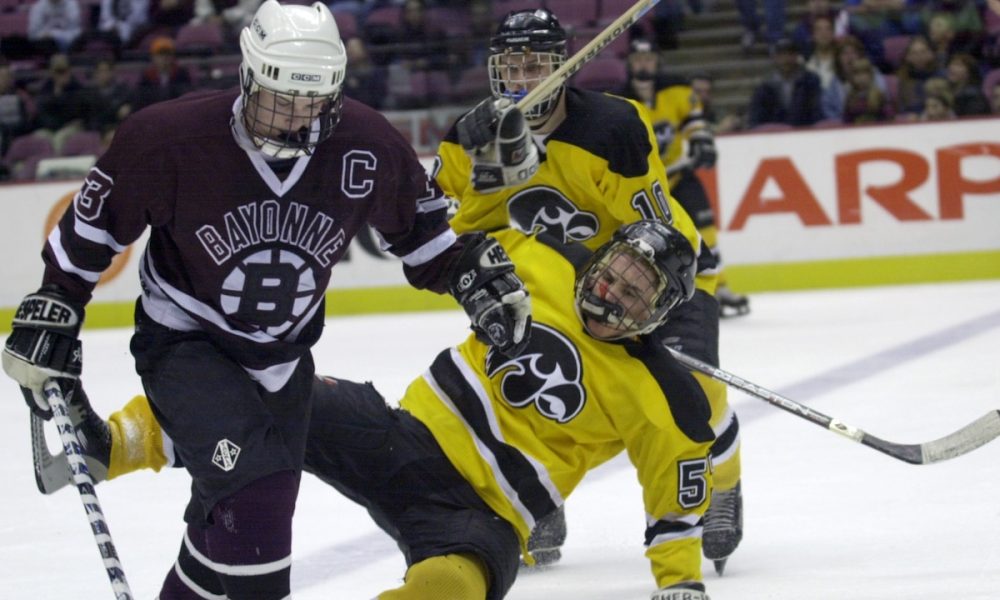 Hudson Catholic’s Benett Shelly (#57) goes down after being hit by Bayonne’s Dave Bodson (#13 left) in the NJSIAA/New Jersey Devils Tournament of Champions final hockey...