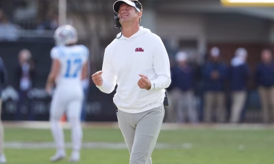 Mississippi head coach Lane Kiffin reacts to a official’s call during the second half of an NCAA college football game against Mississippi State, Friday, Nov. 28,...