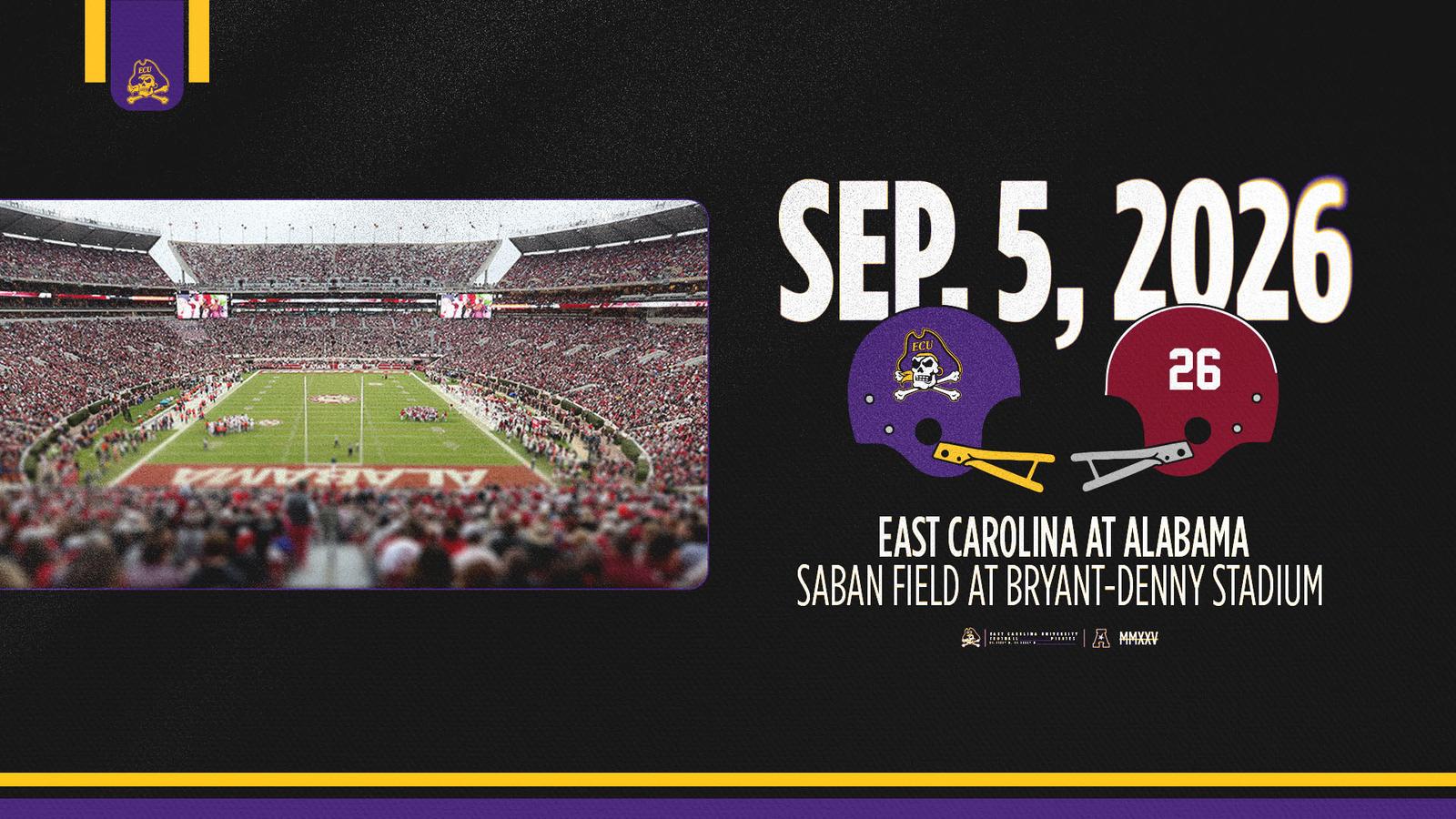GREENVILLE, N.C. – East Carolina and Alabama have agreed to play a non-conference football game on Sept. 5, 2026 on Saban Field at Bryant-Denny Stadium according to a joint announcement by both institutions.