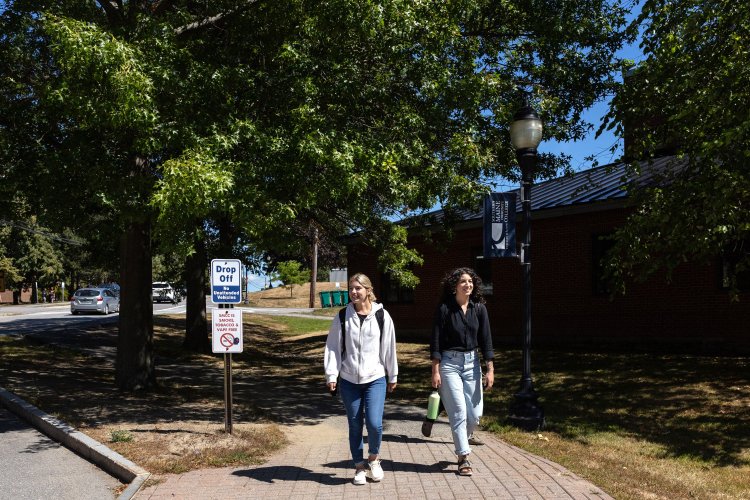 Taylor Erwin, right, and Hannah Rote walk to the dining hall on the Southern Maine Community College campus in South Portland on Thursday. (Brianna Soukup/Staff Photographer)