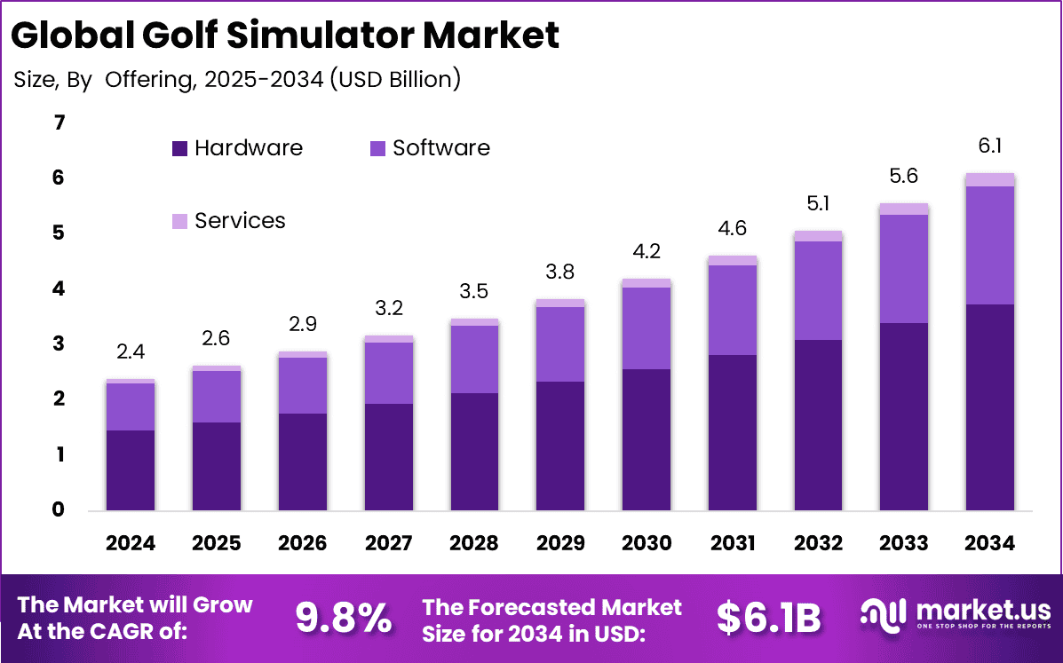 The Global Golf Simulator Market is poised for substantial growth, projected to reach USD 6.1 billion by 2034, up from USD 2.4 billion in 2024, with a CAGR of 9.8% during the forecast period from 2025 to 2034. The rise in popularity of indoor golfing, advancements in simulation technology, and the increasing focus on training and entertainment are key factors driving this growth.