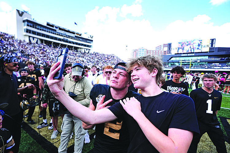Vanderbilt quarterback Diego Pavia (2) poses with a fan after the team’s win after an NCAA college football game against LSU, Saturday, Oct. 18, 2025, in Nashville, Tenn. (AP Photo/George Walker IV)