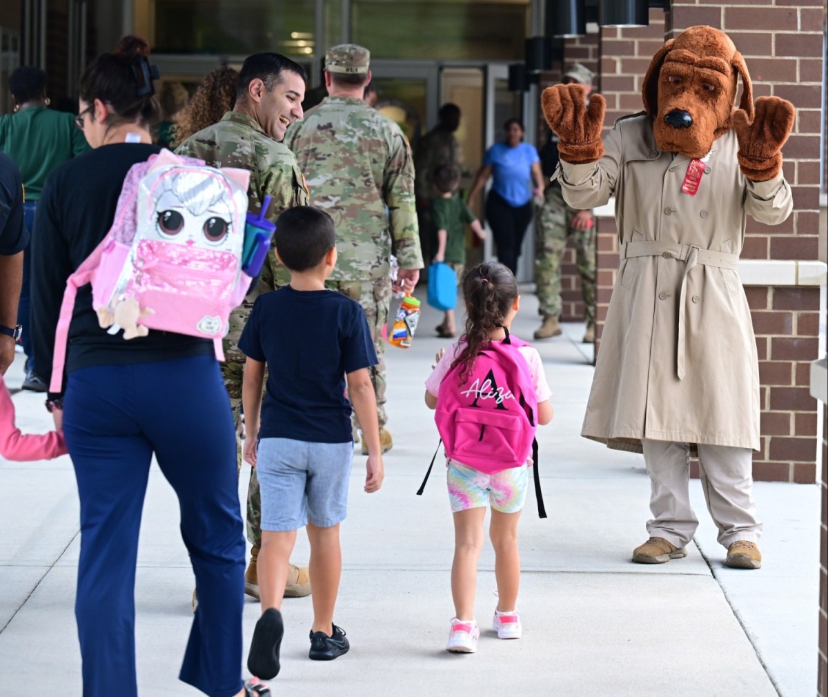 McGruff the Crime Dog welcomes students and their parents to Pierce Terrrace Elementary School, Aug. 4, 2025. It was the first day of the new school year for Department of Defense Education Activity schools on Fort Jackson. (Photo Credit: Robert Timmons)