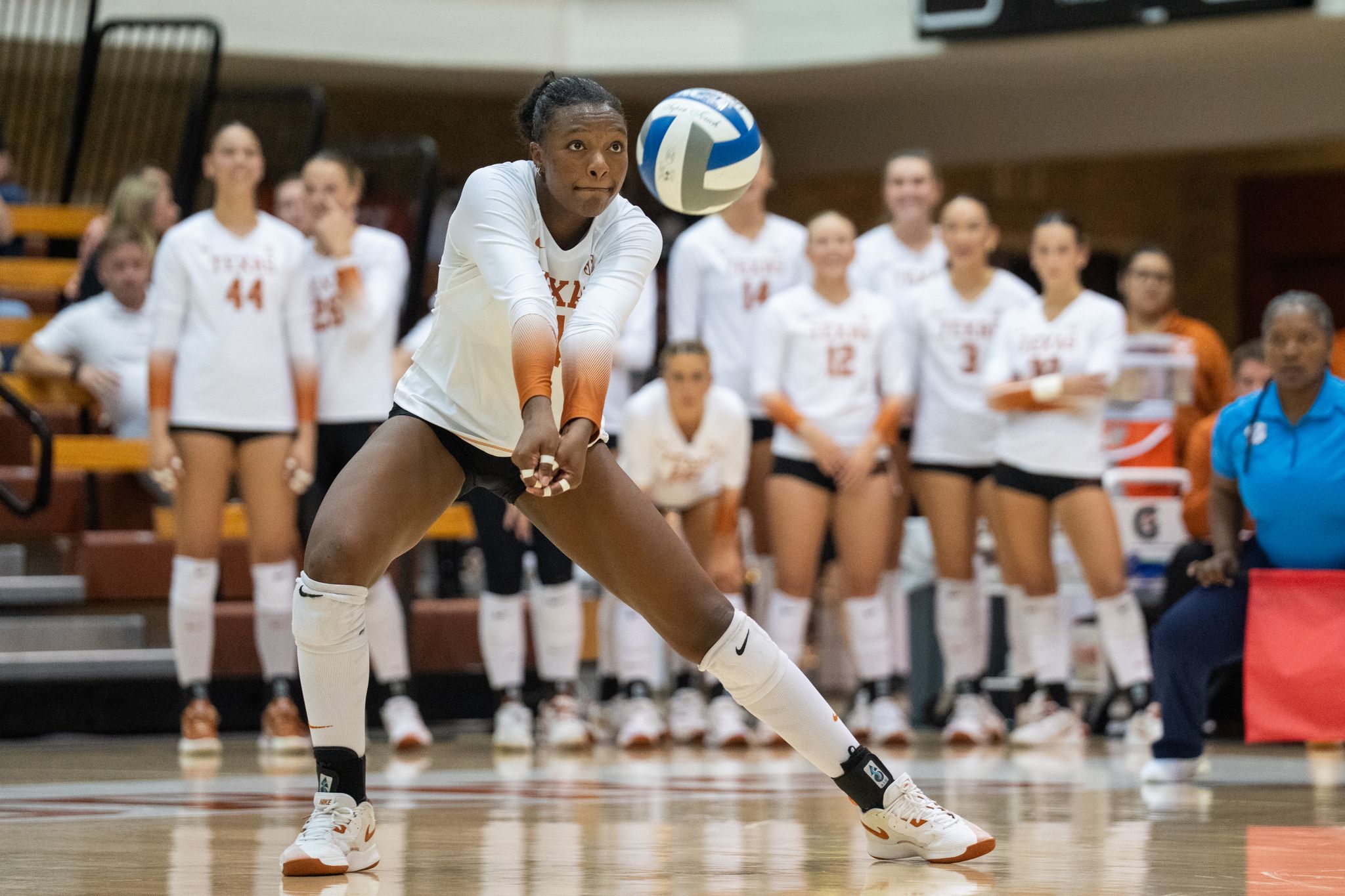 Vandy’s Kamryn Chaney rips off four points with a nasty fastball from the service line to give her team an early lead, but Texas coach Jerritt Elliott passes on a timeout and lets his team figure things out. Texas leads 1-0.