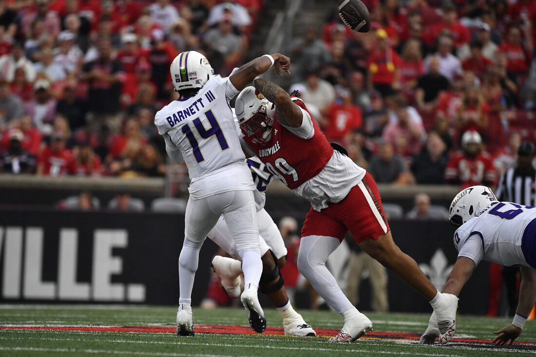 Louisville defensive lineman Jordan Guerad (99) hits James Madison quarterback Alonza Barnett III (14) who releases a pass during the first half of an NCAA college football game in Louisville, Ky., Friday, Sept. 5, 2025. (AP Photo/Timothy D. Easley)