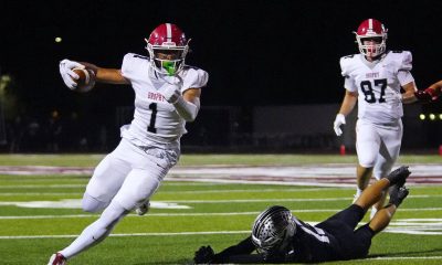 La Habra Coach Frank Mazzotta with players DJ Mitchell, Bobby Brooks, Luke Hedgpeth, Noah Poppin and Kevika Mata’Utia-Martinez at Tuesday’s CIF press conference at The Grand....