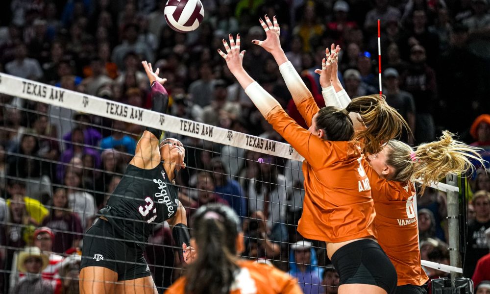 Texas A&M outside hitter Kyndal Stowers (37) spikes the ball during the game against the Texas Longhorns at Reed Arena on Friday, Oct. 31, 2025 in...