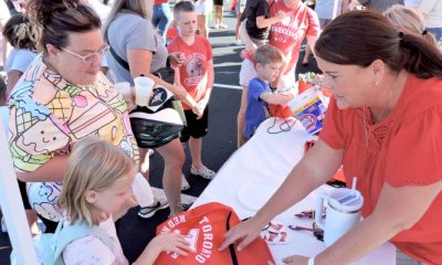 GETTING READY — Annie Silverthorn, right, principal of Toronto Elementary School, presented a Toronto Red Knights book bag to Raylenn Barnhart, a...