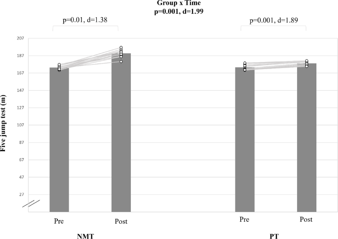 Data are presented as group mean values and standard deviations (SD). After data normality was confirmed using the Shapiro–Wilk test, a MANOVA was applied to detect baseline between-group differences. A 2 × 2 analysis of variance (ANOVA) with repeated measures was computed on the factors group (NMT, PT) and time (pre, post) to determine training effects. Post-hoc tests with Bonferroni adjustments were conducted to identify group-specific pre- to post changes. Effect sizes for main time and group effects as well as group-by-time interactions were taken from the ANOVA output (partial eta squared transferred to Cohen’s d). Within-group Cohen’s d effect sizes (ES) were also calculated using the equation: d = (mean post − mean pre-) / mean SD.