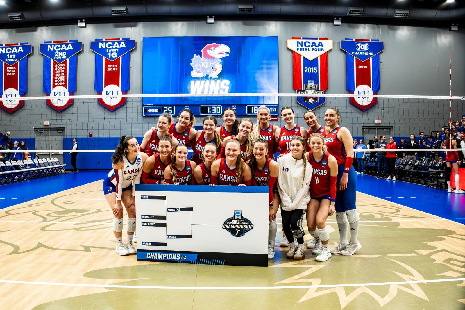 Kansas will take on Miami at 6 p.m. CT on Friday at Horejsi Family Volleyball Arena. Miami defeated Tulsa, 3-1, in Thursday’s first round matchup.