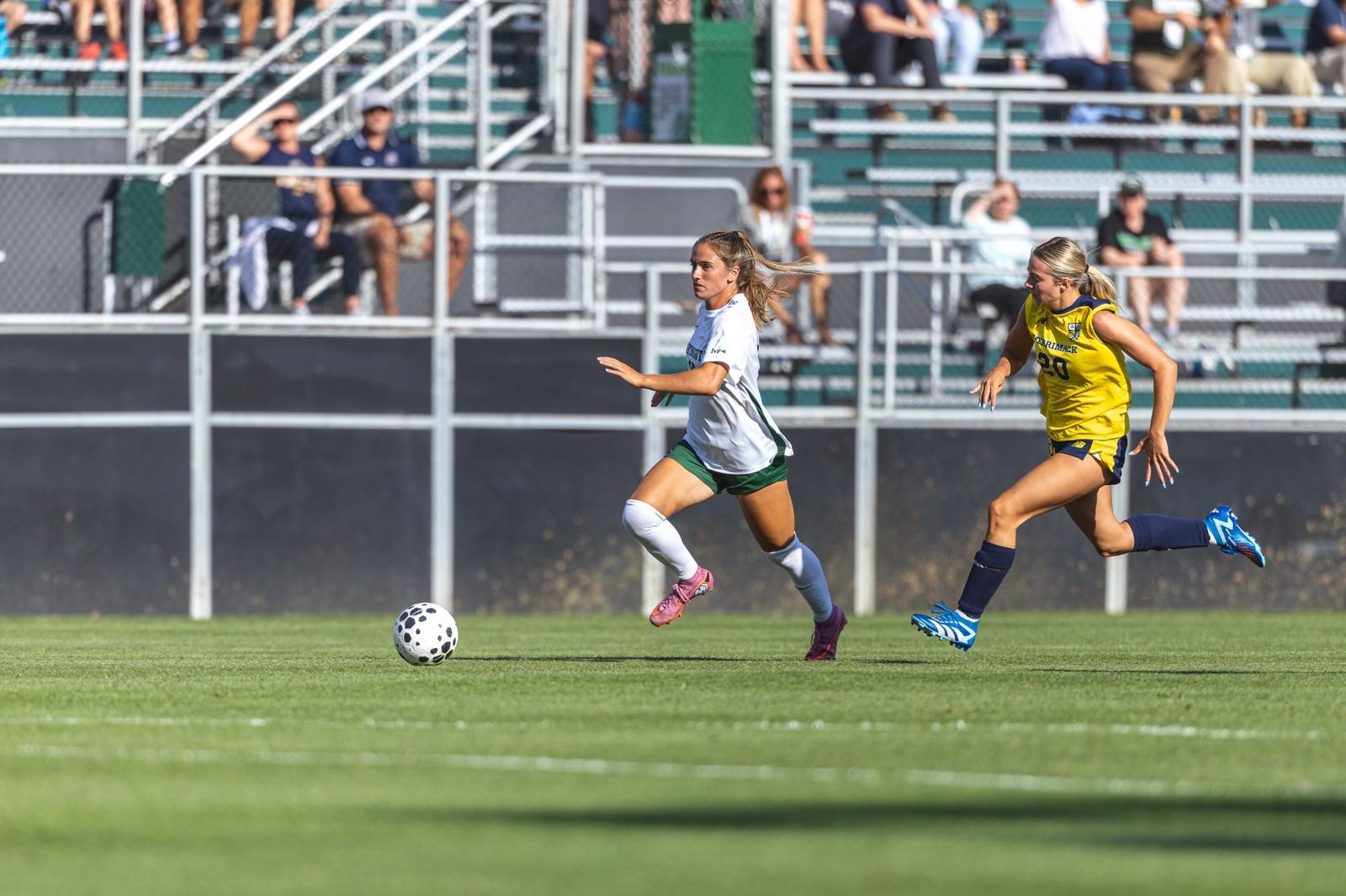 Ellie Davidson and Stephanie Lathrop connected with Maeve Theobald for her fourth goal of the season, putting Dartmouth on the board in the 12th minute. Theobald continues to lead the league in goals.