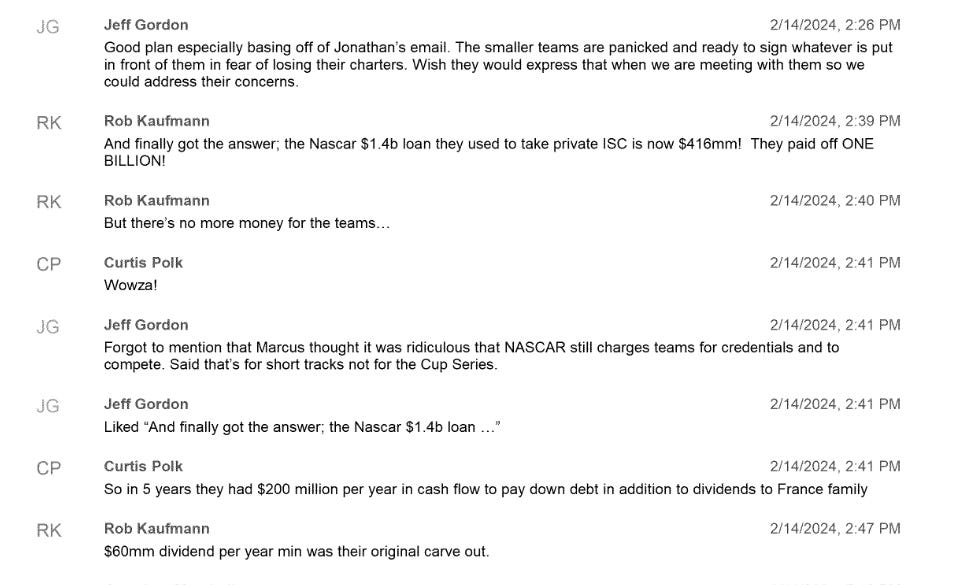 In going through some of the court documents, what I found was the antitrust suit was the final straw in a long-running saga. Teams had been trying to collectively bargain for better terms for years, but were operating in fear over retaliation from the France family. As this discussion between NASCAR legend Jeff Gordon and financier Rob Kaufmann shows, weaker teams were so terrified in negotiations they would “sign whatever is put in front of them” for fear NASCAR would eliminate their charters. Meanwhile, NASCAR had $200 million in annual cash flow for dividends and debt payments.