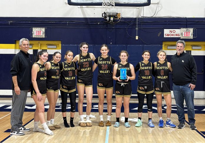 The Scotts Valley girls’ basketball team finished with a 3-0 record at The King’s Academy Tournament that took place Dec. 11-13. The Falcons currently own a perfect 9-0 overall record as they head into the second half of the 2025-26 winter campaign. (contributed by Stu Hurvitz)