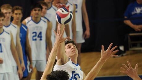 - From left, Tyler Herget, AJ Cottle and Trent Moser rise up for a block against St. Francis in a men’s college volleyball match at the Smith Fieldhouse on Friday, Jan. 9, 2026.