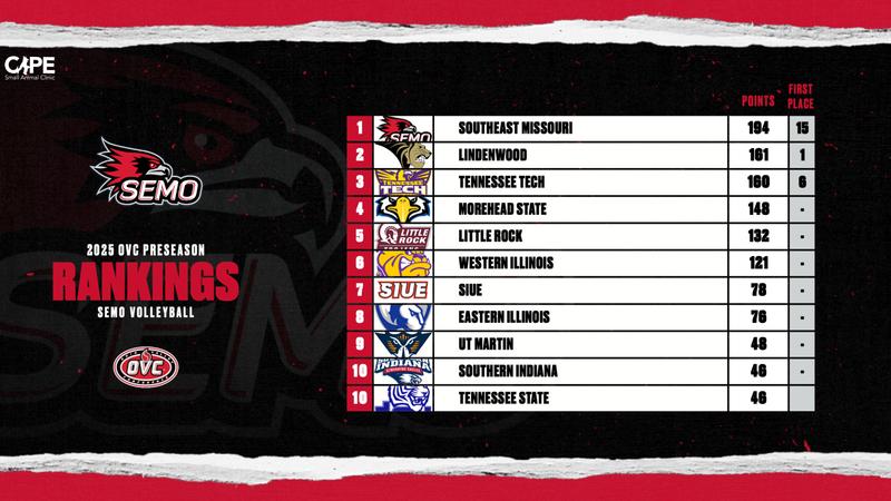 BRENTWOOD, Tenn. – Southeast Missouri Volleyball was picked to finish first in the 2025 Ohio Valley Conference Preseason ‘Pridicted Order of Finish’, the league announced on Thursday afternoon.